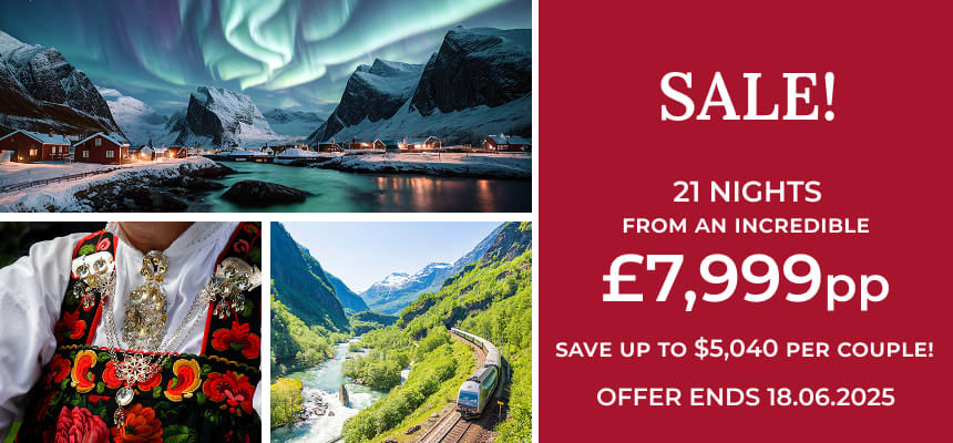 Your journey commences in Oslo, a city renowned for its vibrant arts scene and modern architecture. From here you’ll prepare for your tour of Norway’s highlights; board the Flåm Railway for a train journey that meanders past lush valleys and snow-capped peaks. Immerse yourself in the quaint charm of Flåm village and witness the dramatic beauty of the UNESCO-listed Nærøyfjord during a scenic boat tour.